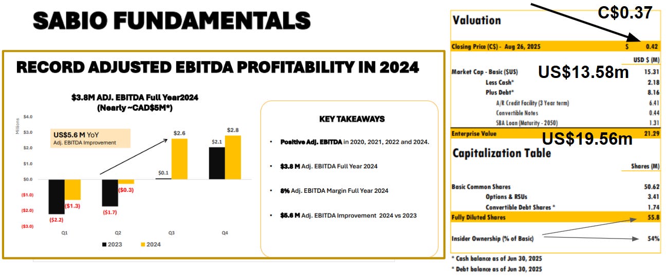 So the potential here for a VERY successful 2026 for Sabio looks attractive. Please run your own math, but here at a share price of $0.37 CAD I get a USD market cap of $13.58M and a USD Enterprise Value of $19.56M. In 2024 they increased their adjusted EBITDA by $5.6M to a positive $3.8M and if they can do that again in 2026 that gives them an EV/adjustedEBITDA of 5.15x for a high growth company - and with potential they outperform their 2024 numbers.