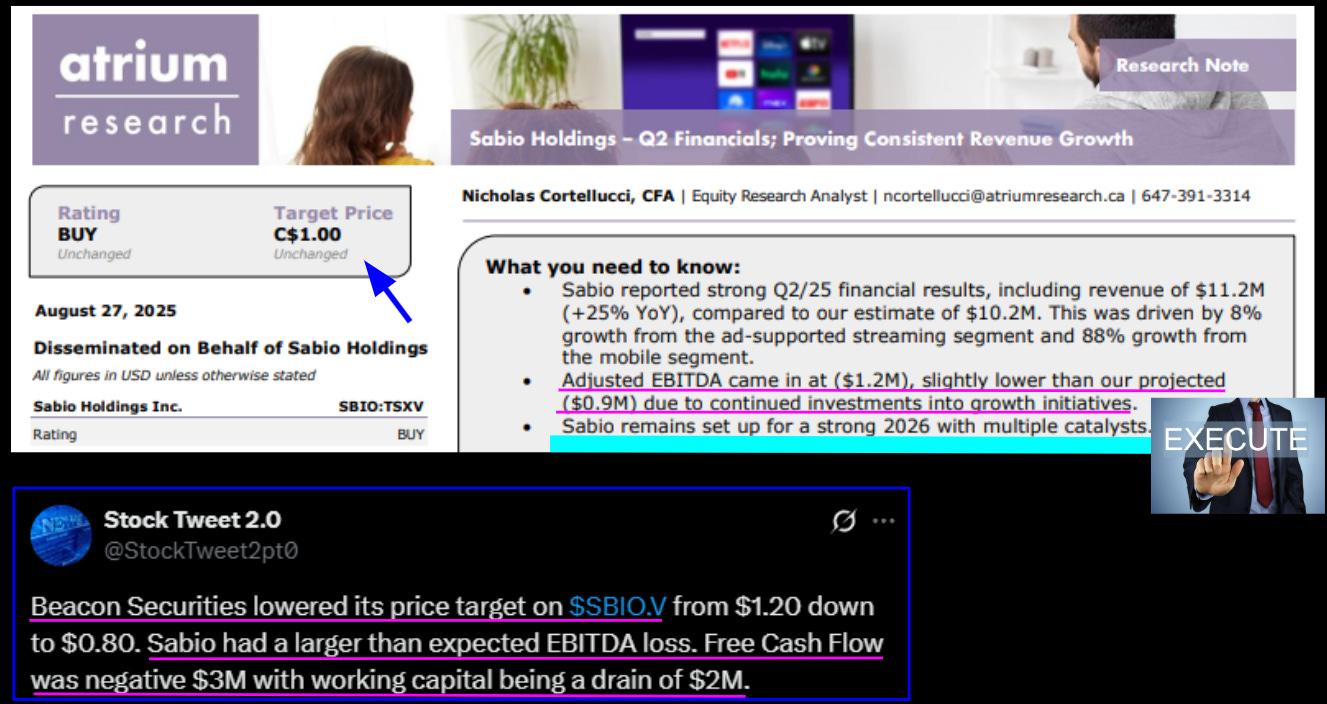 Ultimately I believe most “RISKs” are just the noise around CASH. If Sabio captures ~$15M of higher margin political revenue in 2026 I would expect them to be strongly cash positive - but that cash may only begin to offset their current losses in 2025. Then what? The risk here with Sabio is that they simply run out of cash and need a highly dilutive financing at a low share price. Beacon Securities reduced their price target on Sabio, crushing it down from C$1.20 to C$0.80 specifically noting free cash flow losses. It’s a problem.